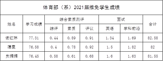 根据《365英国上市推荐优秀应届本科毕业生免试攻读硕士学位研究生工作管理办法》(河财政文【2018】18号)文件精神以及《365英国上市体育部(系)2021届推免生工作实施细则》文件安排,体育部(系)于2020年9月7日16:30—17:30对进入面试环节的2021届推免生申请人逐个进行了面试考核。通过申请人的自我介绍,以及对申请人英语口语、专业技能、创新意识和实践能力等方面的考核,在系部推免生遴选监督工作组的监督之下,推免生遴选工作组分别给出了每一位申请人的面试成绩,并据此计算出综合成绩(综合成绩=学习成绩+素质成绩+面试成绩,其中:学习成绩占90%,素质成绩和面试成绩各占5%)。现将综合成绩公示如下: