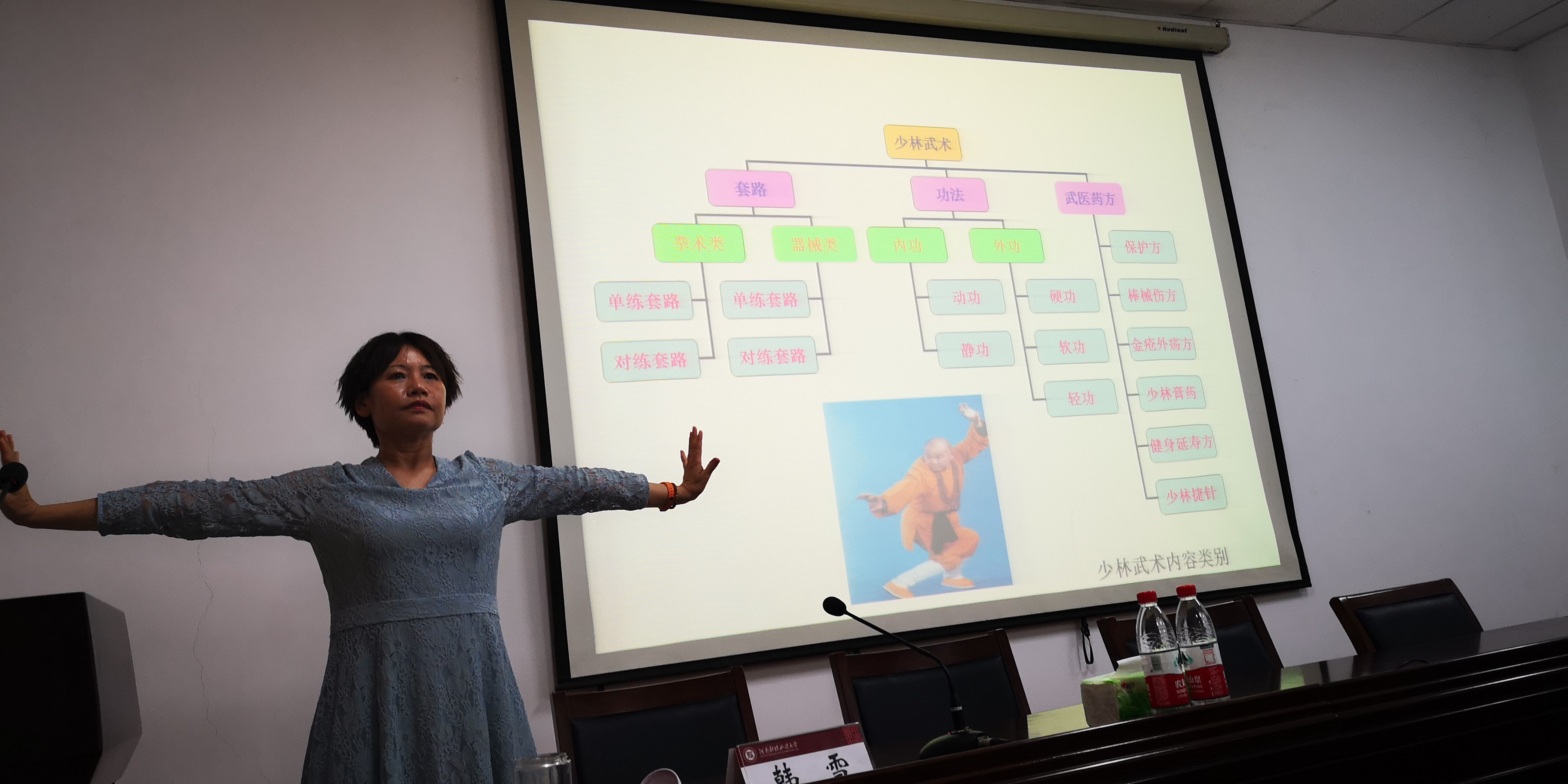 报告会上,韩雪教授以“民族传统体育与中州武术文化”为主题,围绕什么是体育、文化、体育文化、民族传统体育文化以及中州武术文化等方面,进行了明了细致的分析讲解。让我们清楚的了解了不同的民族有各自不同的传统体育,而我们中华民族传统体育的文化内涵博大精深,中华民族传统体育项目包含了997个项目,其中武术挖掘整理工作中,认定了“源流有序,拳理明晰,风格独特,自成体系”拳种129个,我们中州武术则出现了40多种拳种。韩雪教授列举了禅拳一体的少林拳、缠绕螺旋的陈氏太极拳等拳种和文化,师生们通过讲座了解到民族传统体育文化中的文学艺术、拜师仪式、武德思想、祭祖仪式、拳种技术、拳谱拳经等核心文化精神。