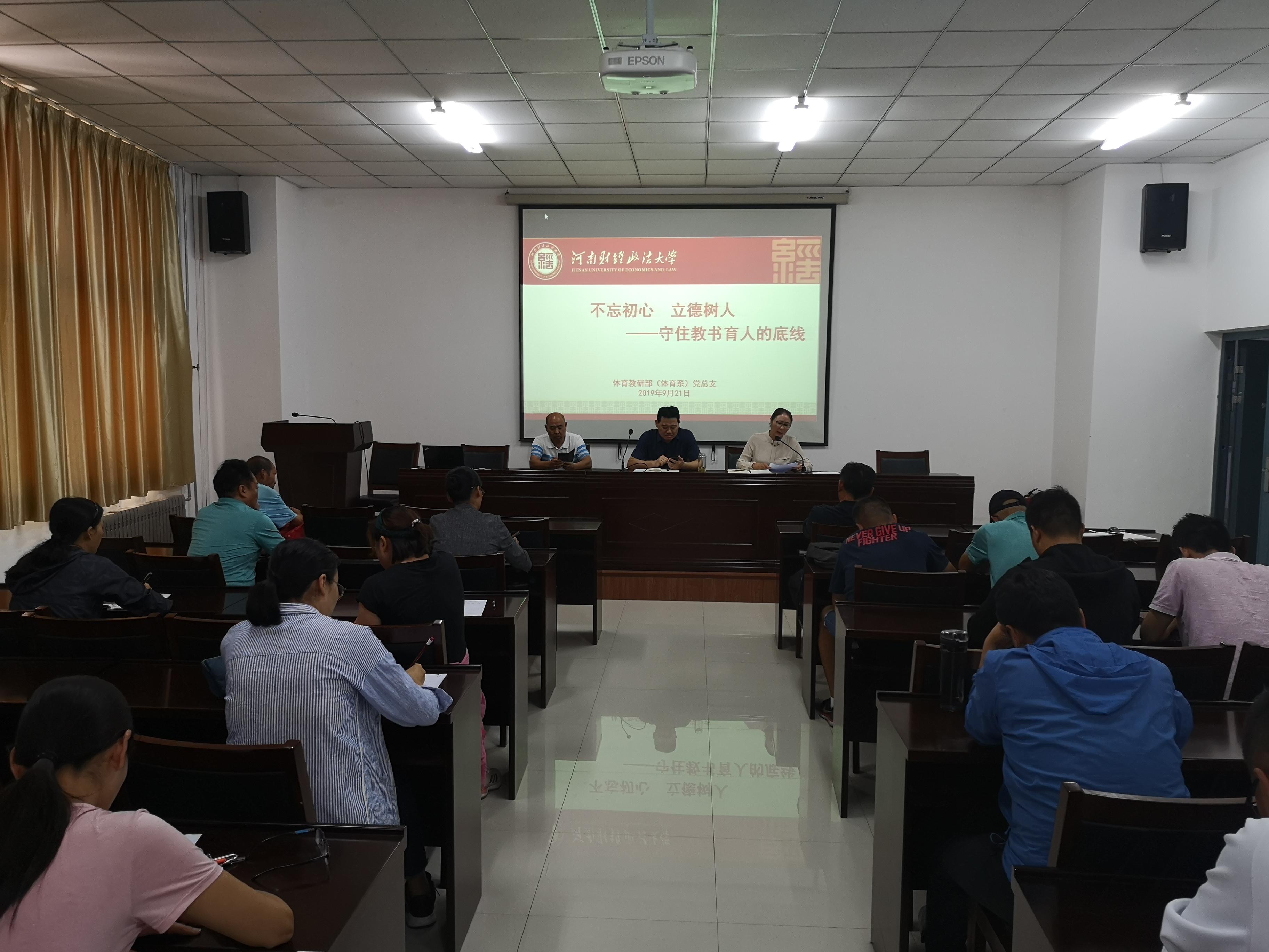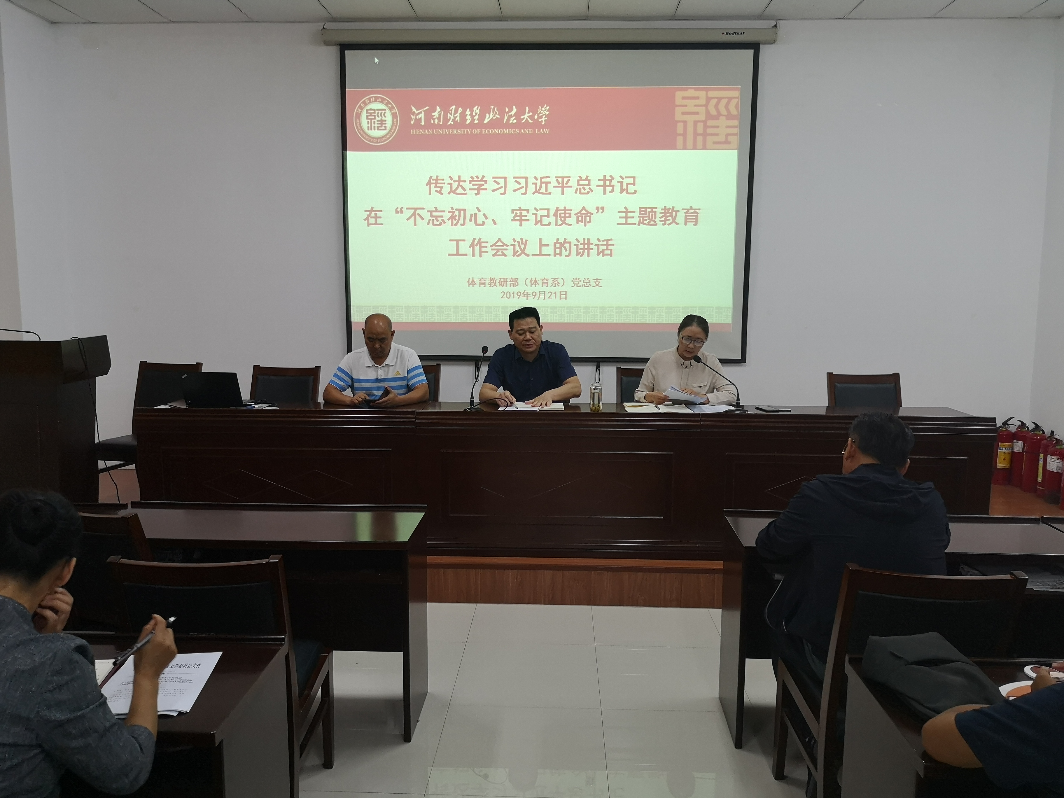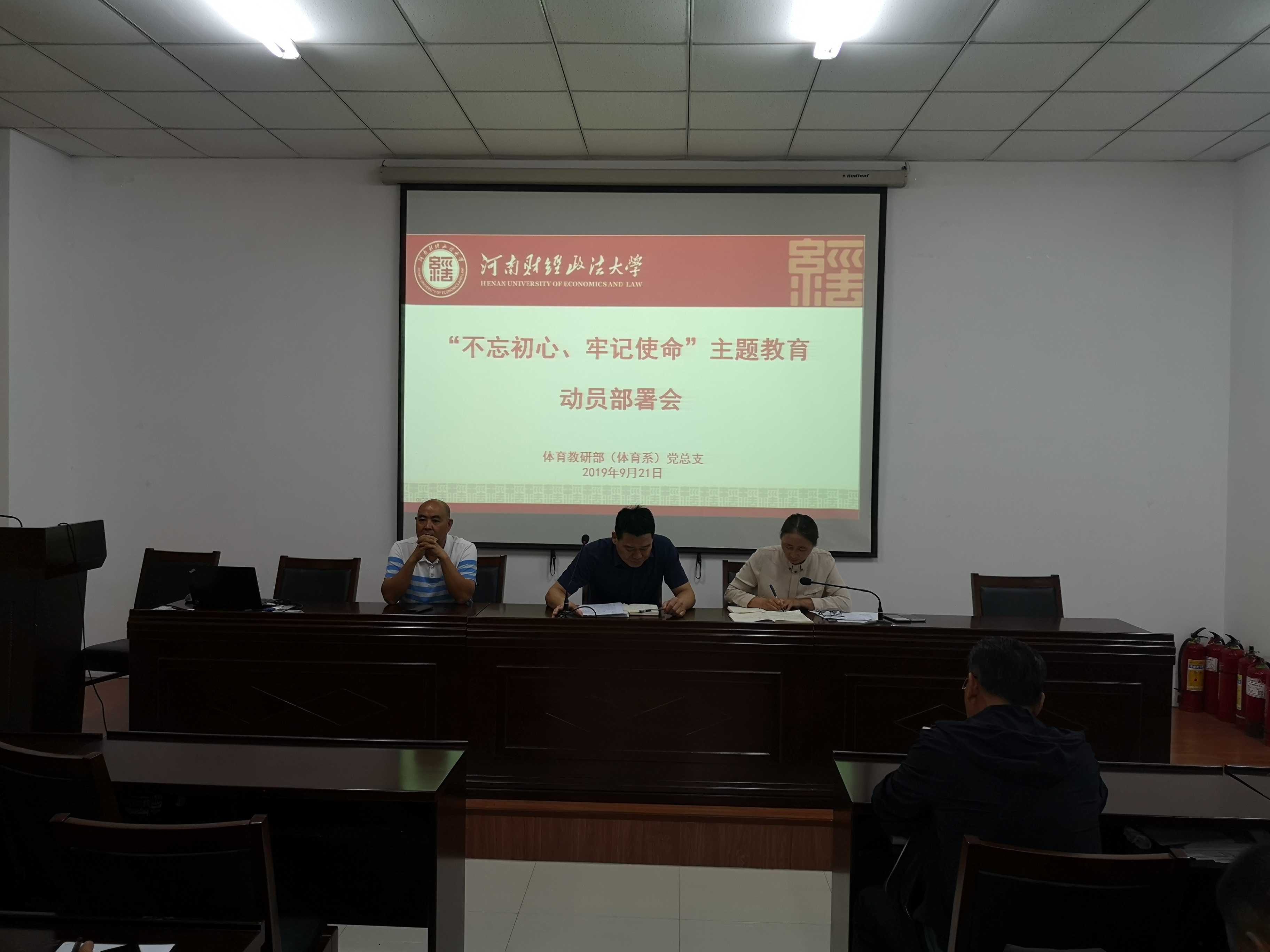 2019年9月21日下午14时30分,体育教研部(体育系)党总支在体育部会议室召开全体会议,进行“不忘初心,牢记使命”主题教育动员部署。