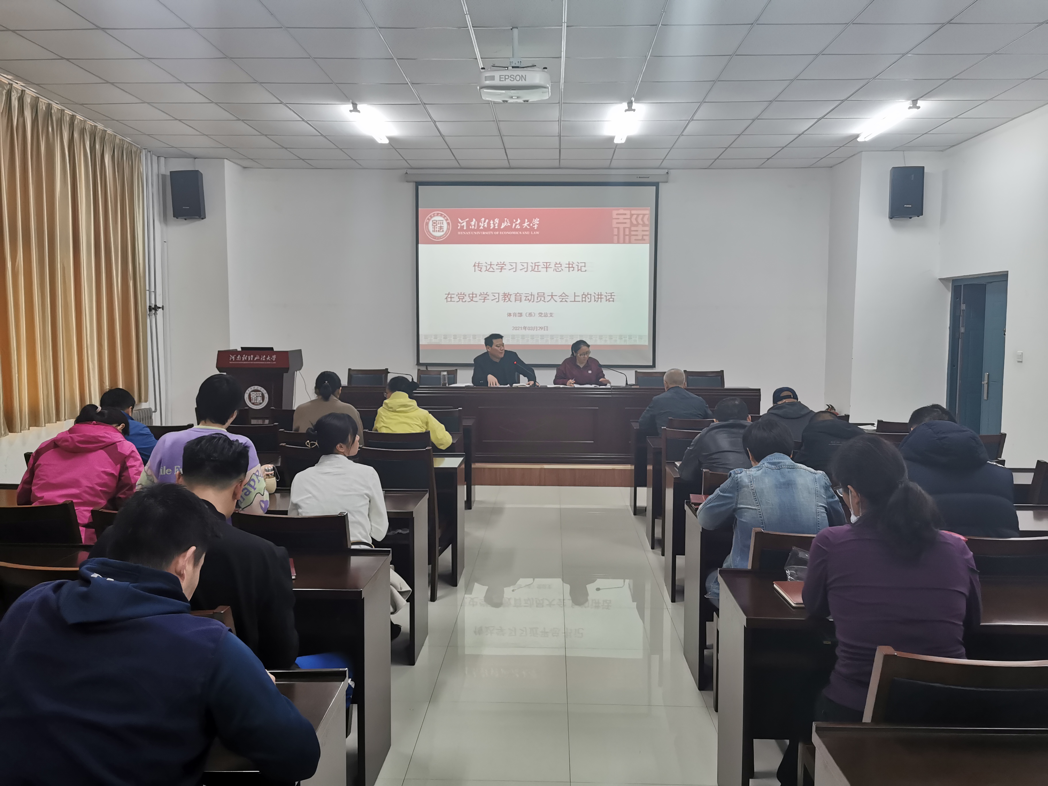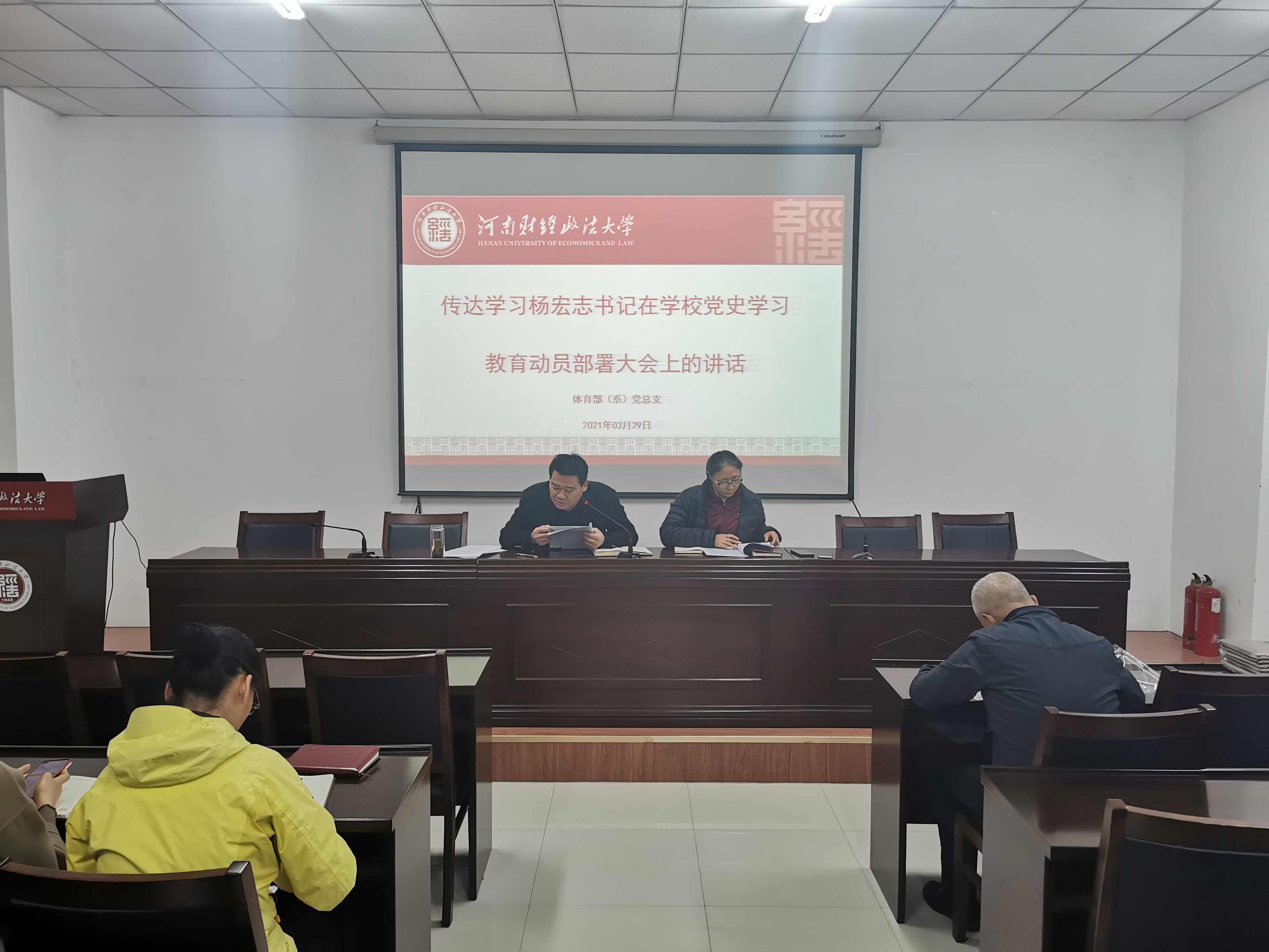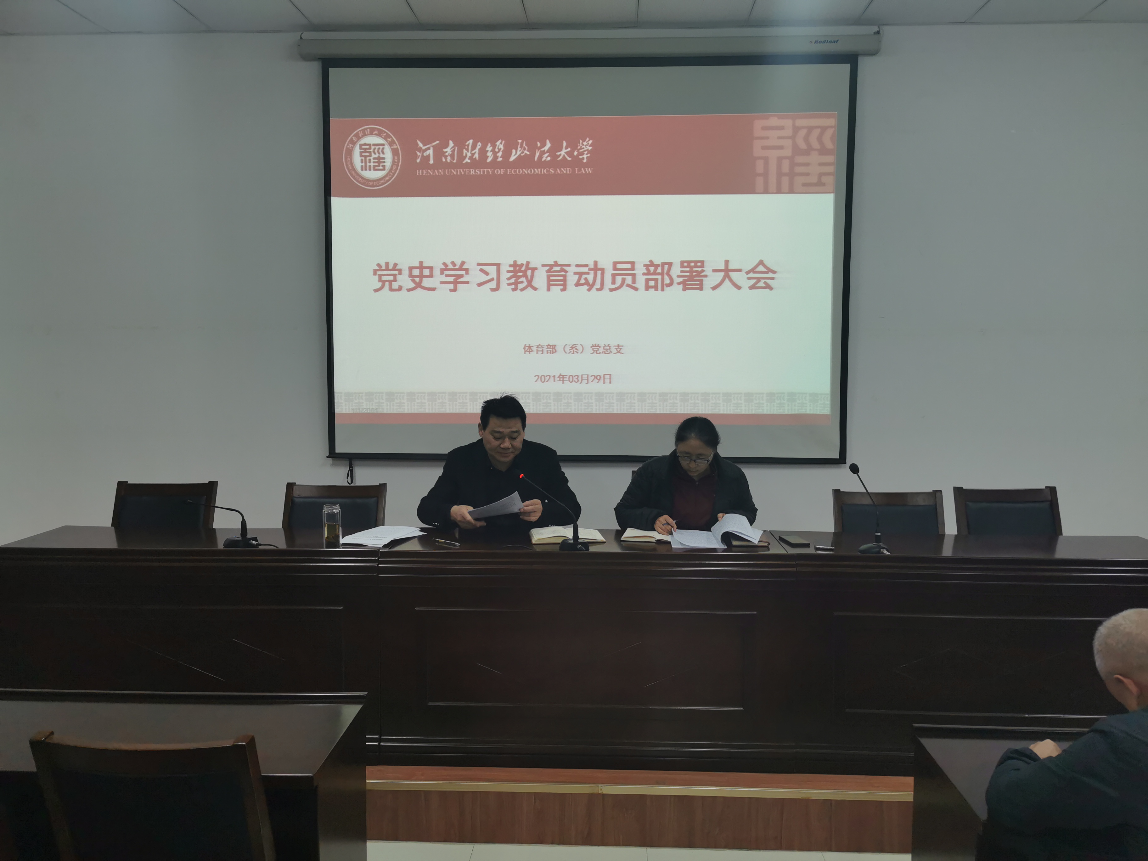 3月29日,体育部(系)党总支在体育部会议室召开党史学习教育动员部署会,会上党总支书记刘国同带领体育部全体党员学习了习近平总书记在党史学习教育动员大会上讲话精神,传达了校党委书记杨宏志在学校党史学习教育动员部署大会上的讲话,对体育部党史学习教育进行了部署。刘国同书记强调,开展党史学习教育,是牢记初心使命,推进中华民族伟大复兴伟业的必然要求,是坚持为党育人为国育才,落实立德树人根本任务的内在要求。要把习近平新时代中国特色社会主义思想贯穿到学习教育全过程,积极拓展党史学习教育的有效路径,着力提升党史学习教育的质量实效,切实在教育教学实践中推动学习再深化、本领再提升、事业再推进。