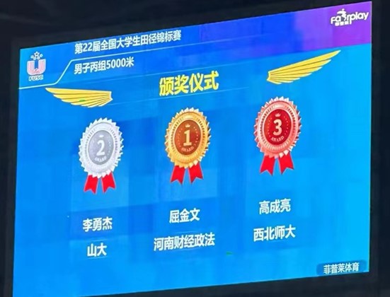 7月15日至20日,第22届全国大学生田径锦标赛在福建南平举行。我校学生屈金文夺得高水平组男子5000米金牌和10000米银牌,学生刘文昭获得男子高水平组1500米第五名,2名学生达到国家一级运动员标准,我校高水平组男子团体成绩排名第36位。
