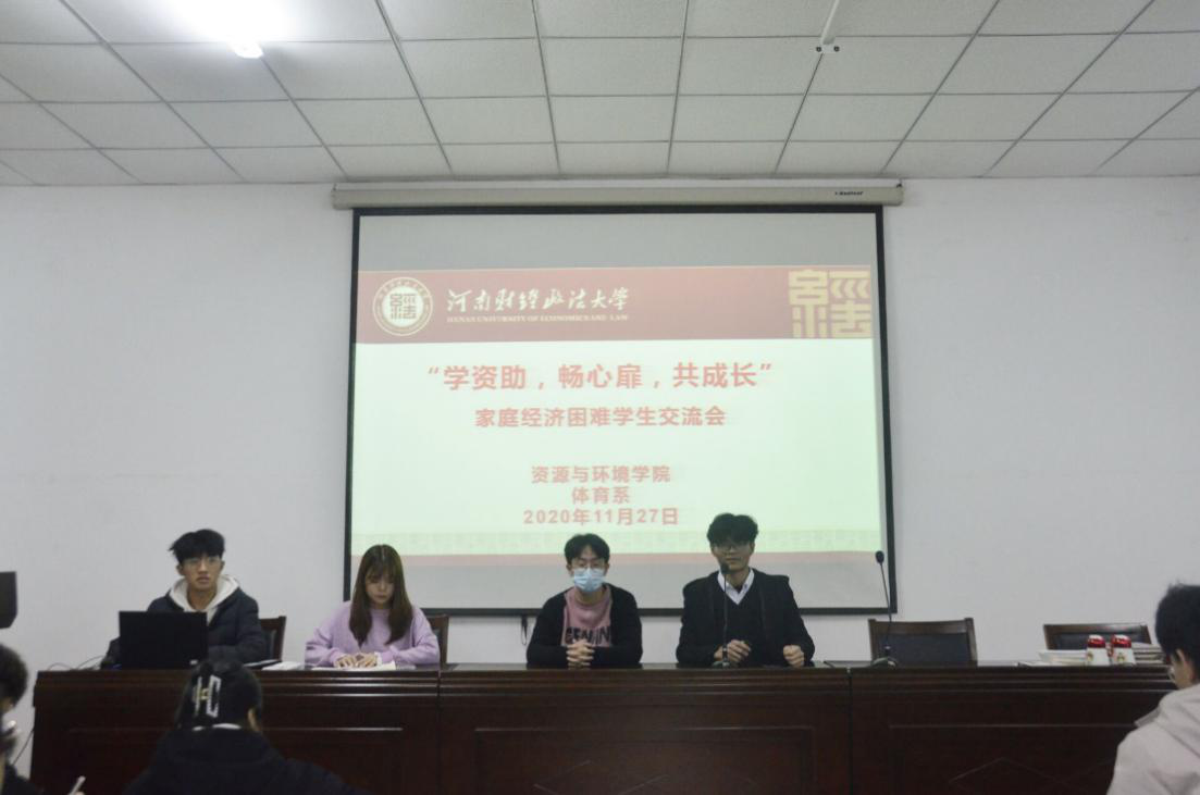 为进一步了解家庭经济困难学生的学习和生活情况,帮助他们解决学习生活以及心理上的问题,2020年11月27日,我系与资源与环境学院勤工部在体育系会议室联合举办了以“学资助,畅心扉,共成长”为主题的家庭经济困难学生交流会,校资助中心主席王阔、资源与环境学院赵恒、体育系李慧云出席,两院系家庭经济困难学生参加活动。