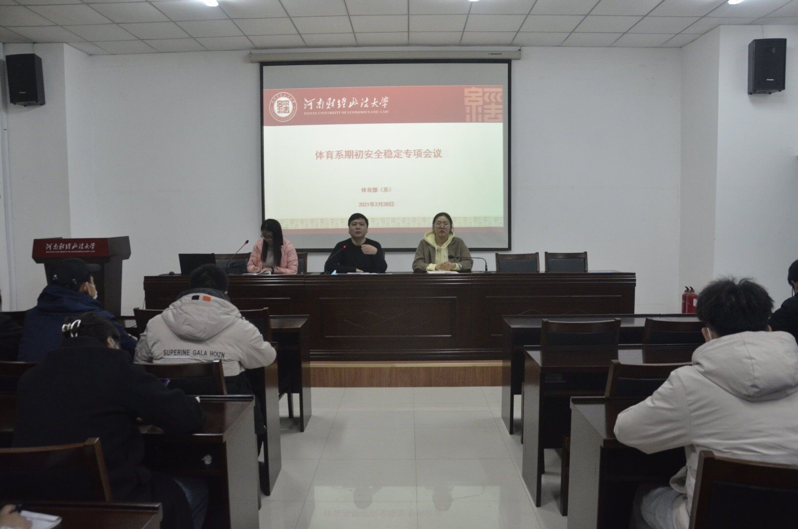 2月28日下午3点,体育系在会议室召开期初安全稳定专项会议,该会议由体育系党总支副书记鲁守璞主持,系团总支书记仝晗笑、兼职辅导员昝笑笑及全体学生参加。