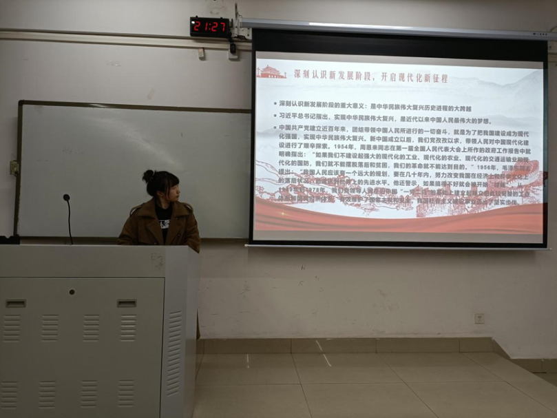 党的十九届五中全会提出,全面建成小康社会、实现第一个百年奋斗目标之后,我们要乘势而上开启全面建设社会主义现代化国家新征程、向第二个百年奋斗目标进军,这标志着我国进入了一个新发展阶段。为了让同学们认识新发展阶段的新目标新任务新要求,12月下旬,体育系召开“深刻认识新发展阶段,开启现代化新征程”主题班会,全体学生共同参与。