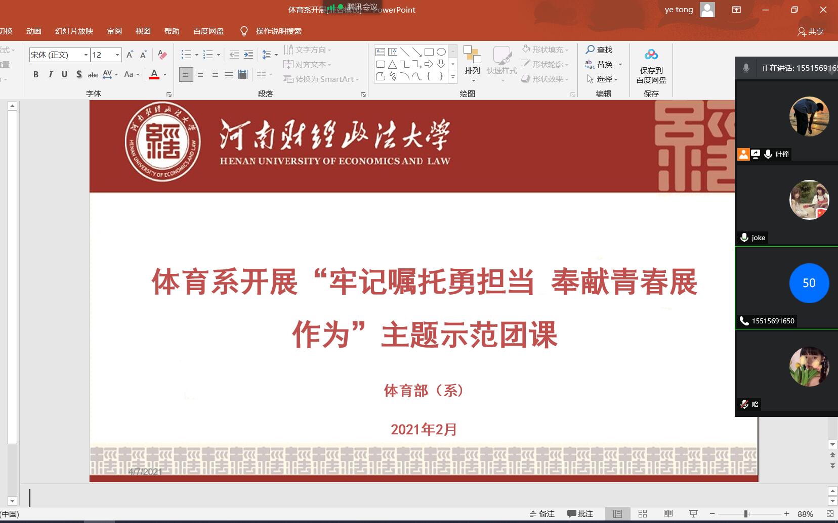 为更好帮助学生青年感悟习近平总书记关于青年工作的重要思想,加强学生思想教育工作。体育系于2月中旬在线上召开“牢记嘱托勇担当,奉献青春展作为”示范主题团课。